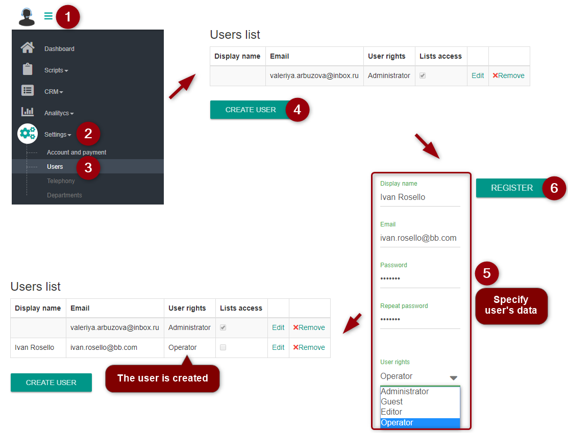To create an account for an employee, specify the following data: name, corporate email, permissions in the system (for sales managers, select "operator"), and the password. The account is successfully created!