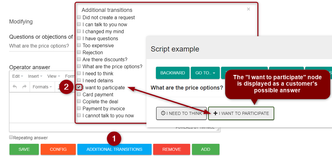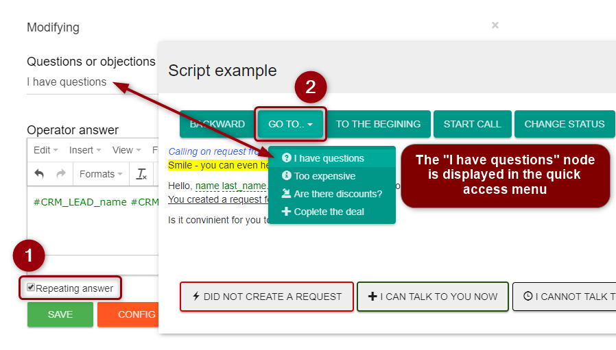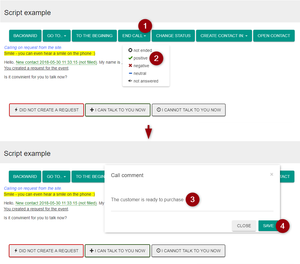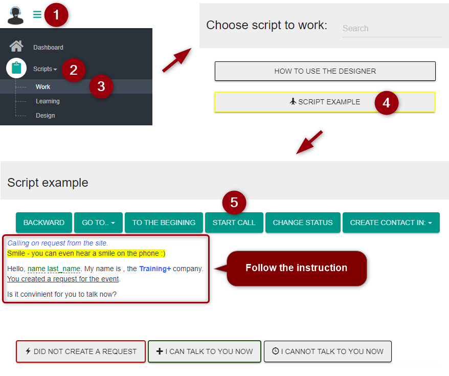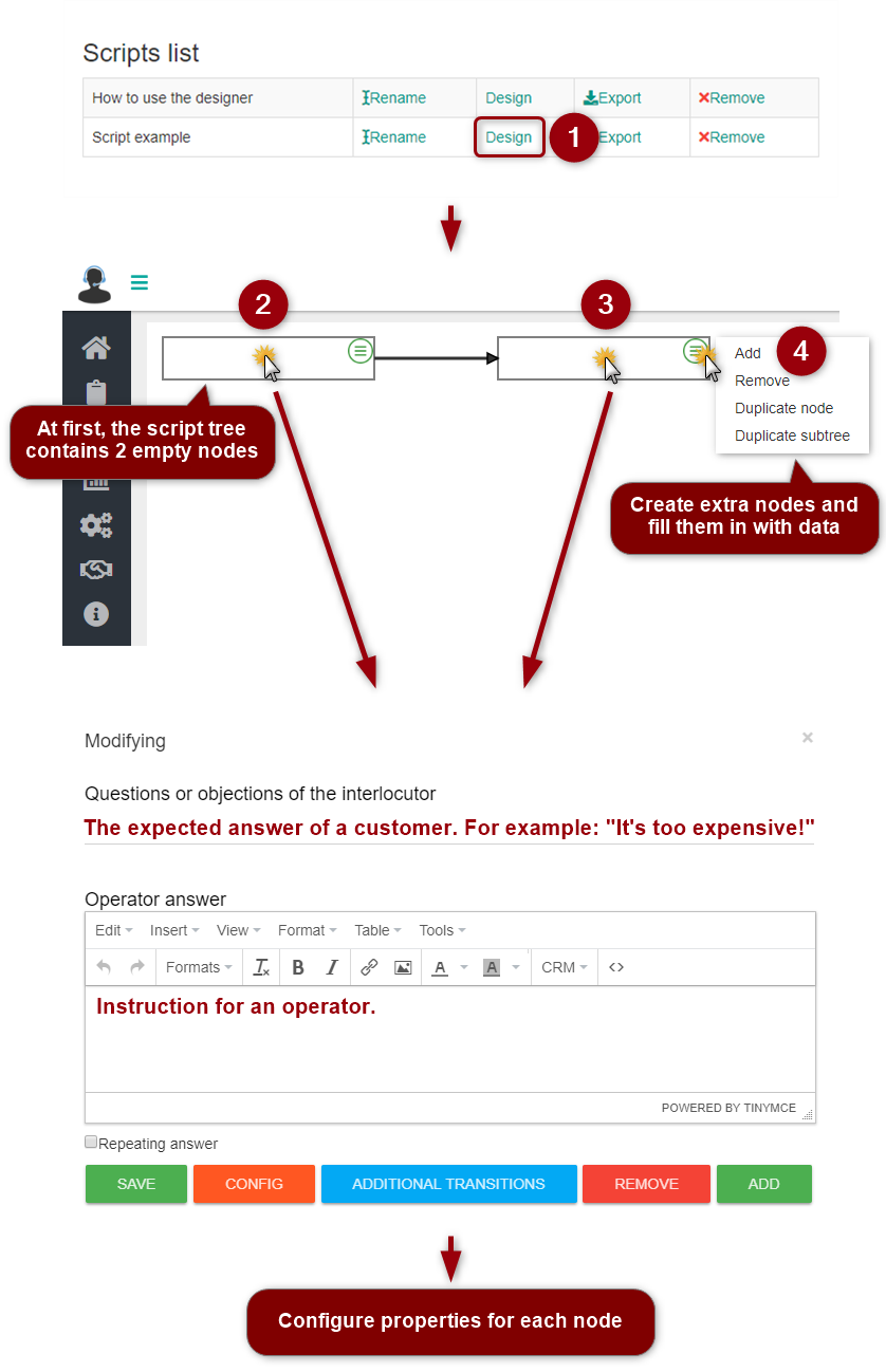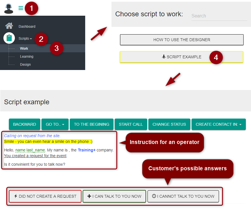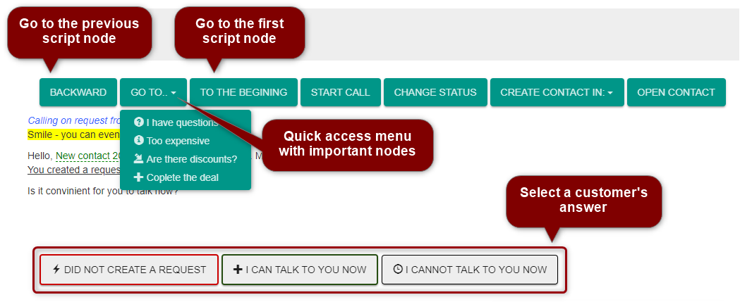 After opening the required script, an operator follows instruction on the screen. Upon receiving the answer, question or objection of the customer, the operator selects the appropriate node with further instruction.