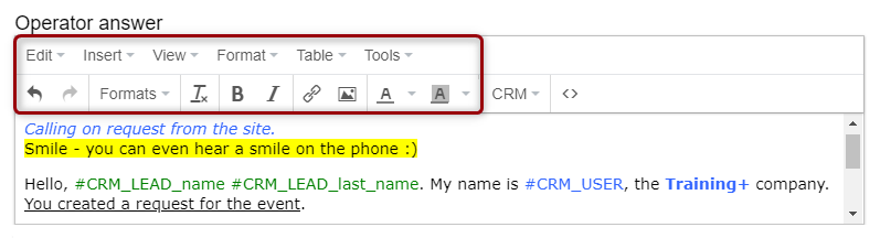 In edit mode, only tags of these fields are displayed (for example, #CRM_LEAD_name).