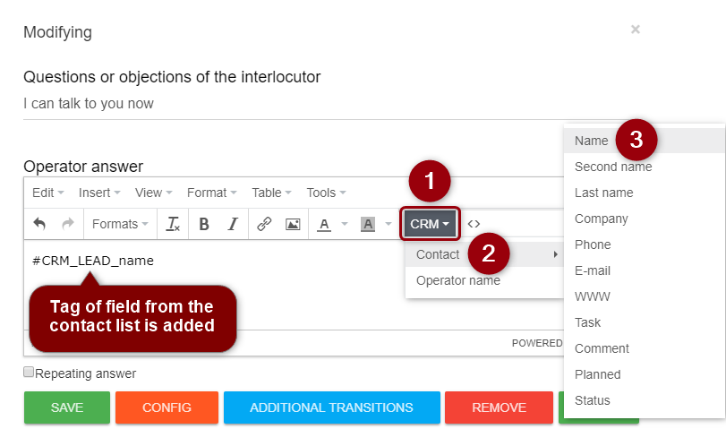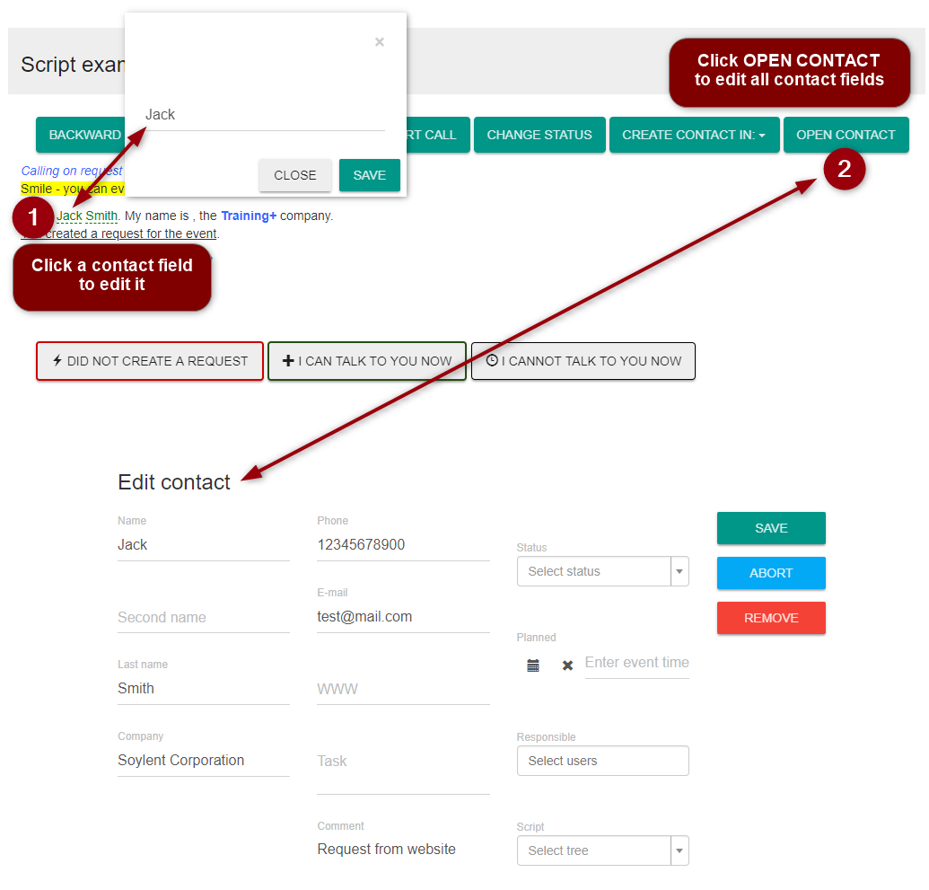 An operator can modify either a single contact field by clicking it in the script text or all fields of the contact by opening the contact card.