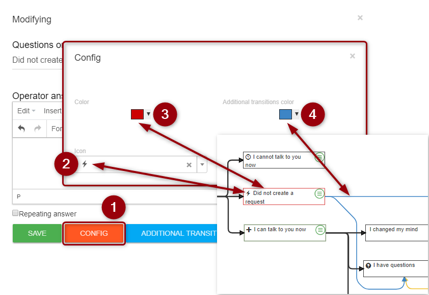 Using different icons and color schemes of nodes and "additional transitions", you will not get confused when changing logic of the most complex conversation.