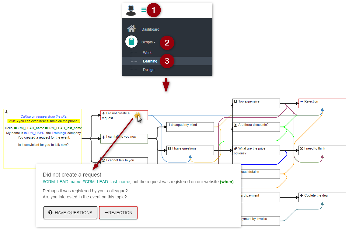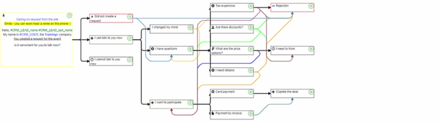 In CallHelper, sales script has a tree form. Each node of the tree contains instruction for an operator in case of the customer's questions or objections.