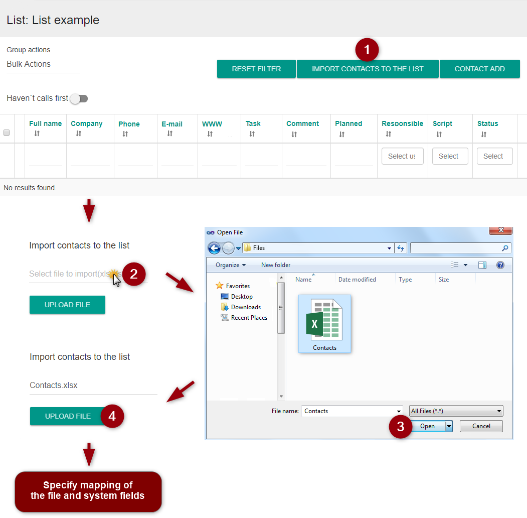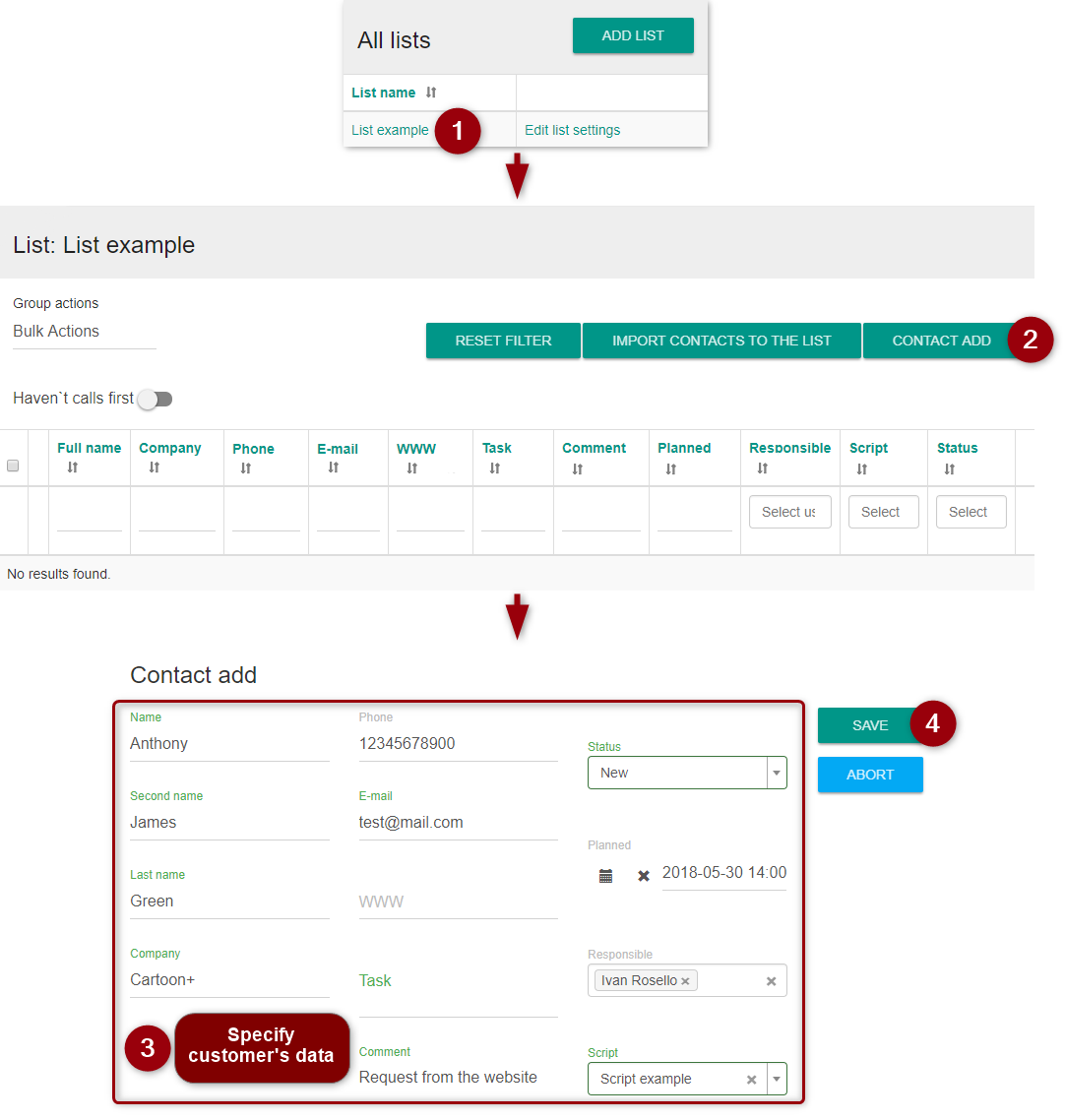 Functionality of contact lists also allows assigning a responsible operator, script, and the planned time of call to each contact.
