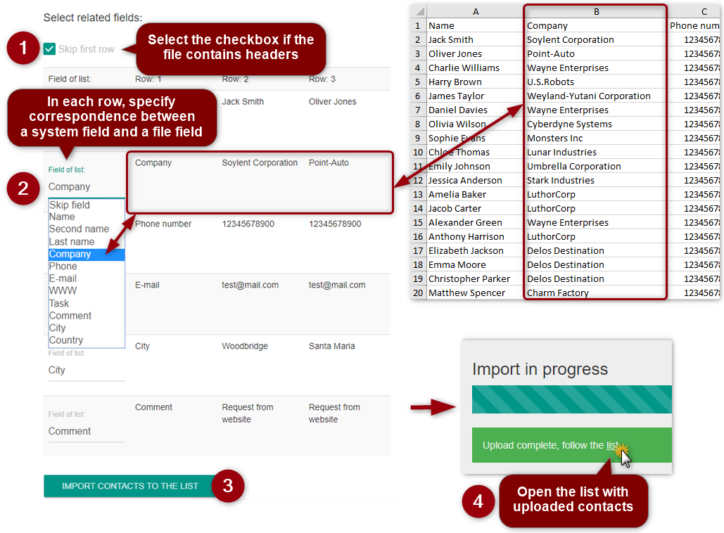 To import contacts, prepare an Excel file in advance (XLS, XLSX, and CSV are supported formats). The import procedure is fast and simple.