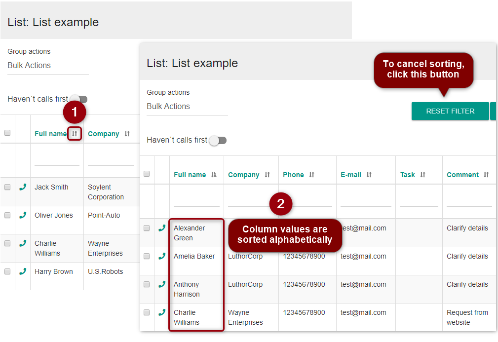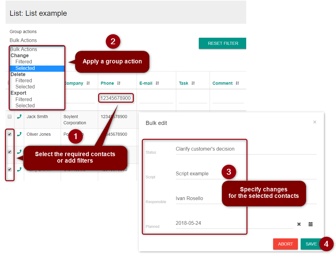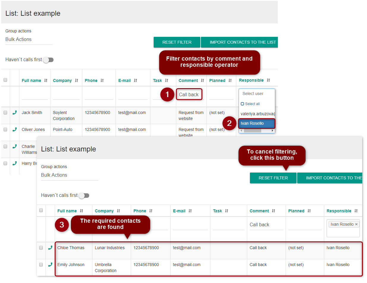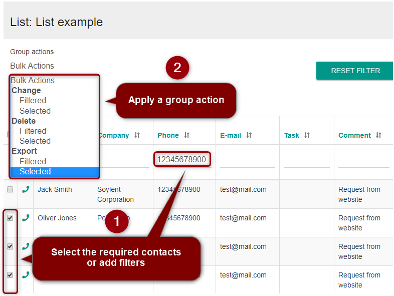 Add filters to columns using the second row of the list and work with the selected contacts only.