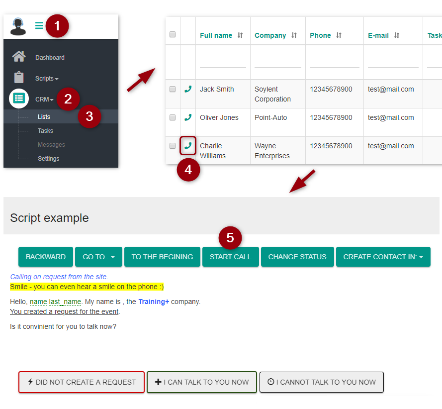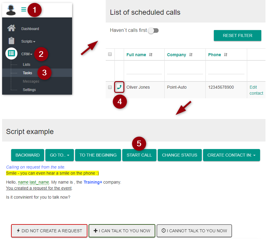 The operator opens the contact list, finds the required contact or filters the list according to the necessary parameters, and starts working by clicking the call button.