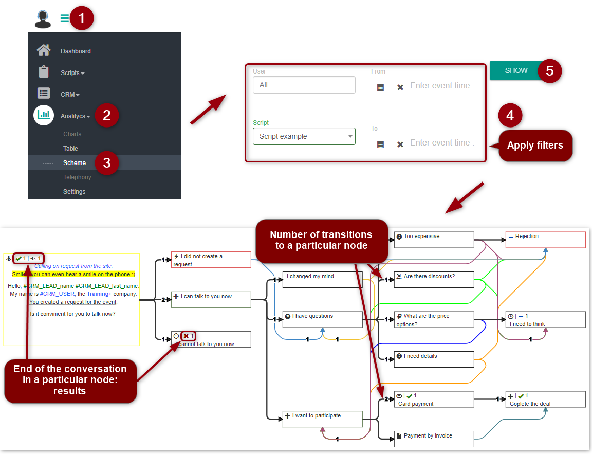 The general calls statistics scheme displays the number of operator's transitions within the script tree and the results of conversation in each node.
